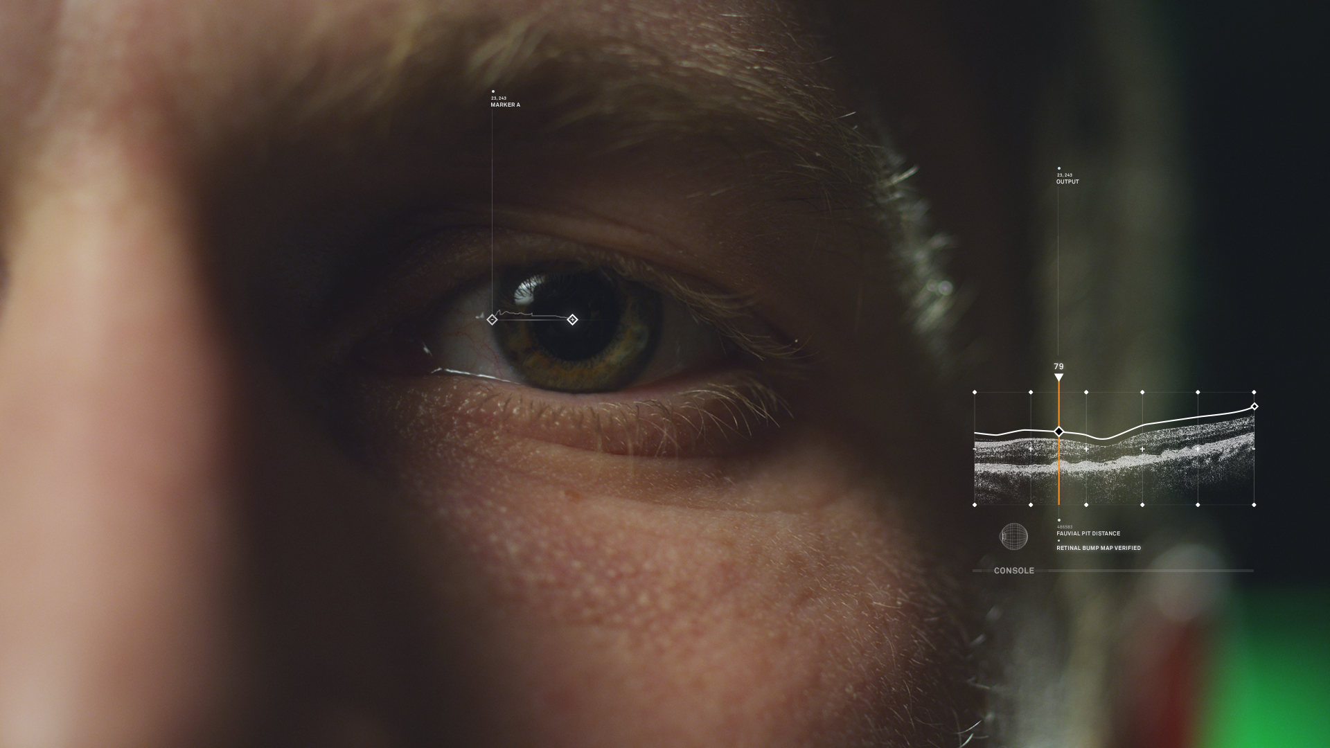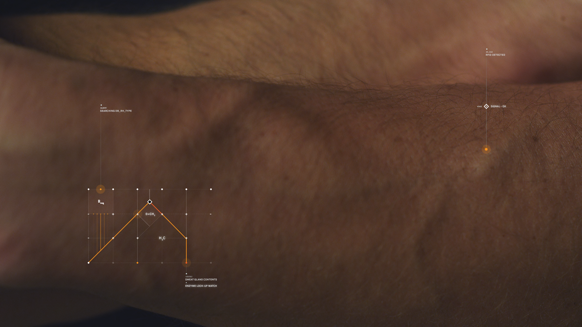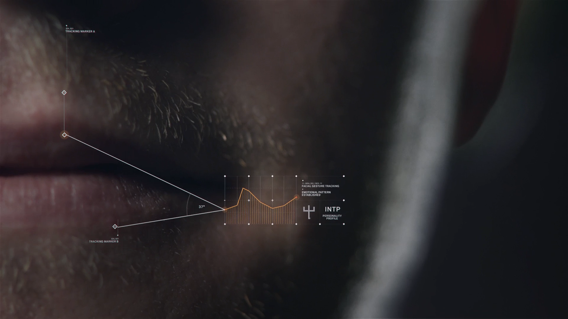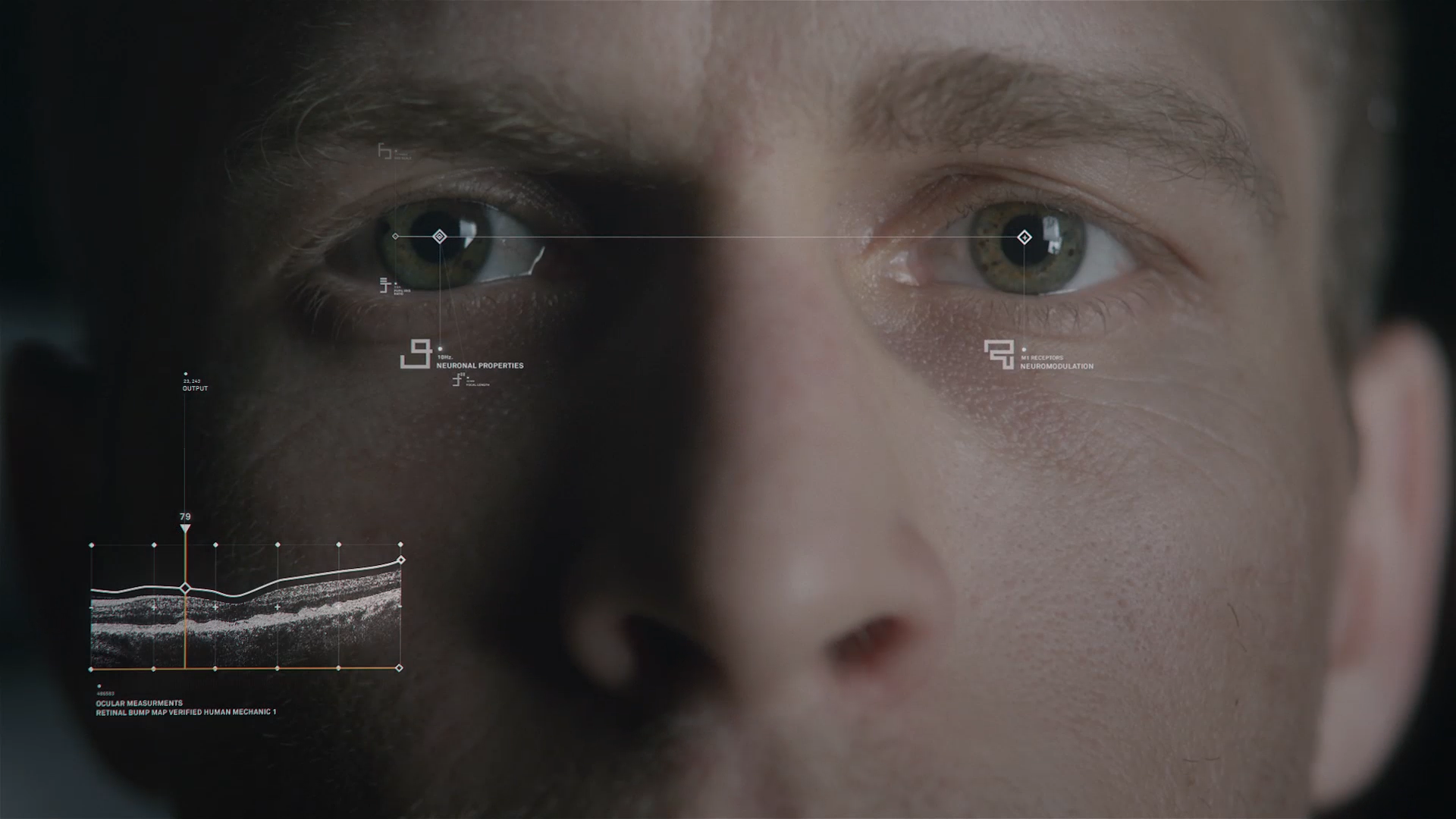 The UI was meant to be as minimal and unobtrusive as possible from the film. The gentle reminder an artificial intelligence is taking you through the film. We wanted to give the viewer the idea that the artificial intelligence gently touched its way through the molecules around a scene, picking up information as it moves.