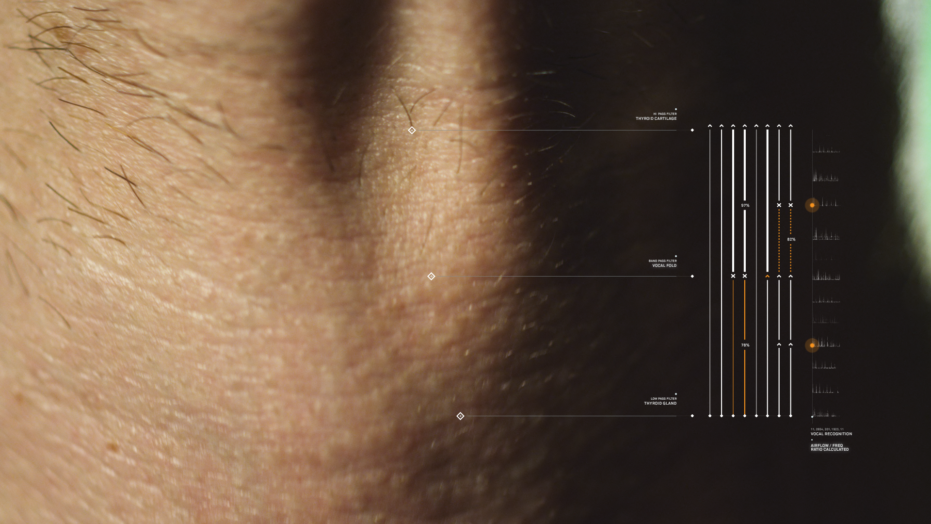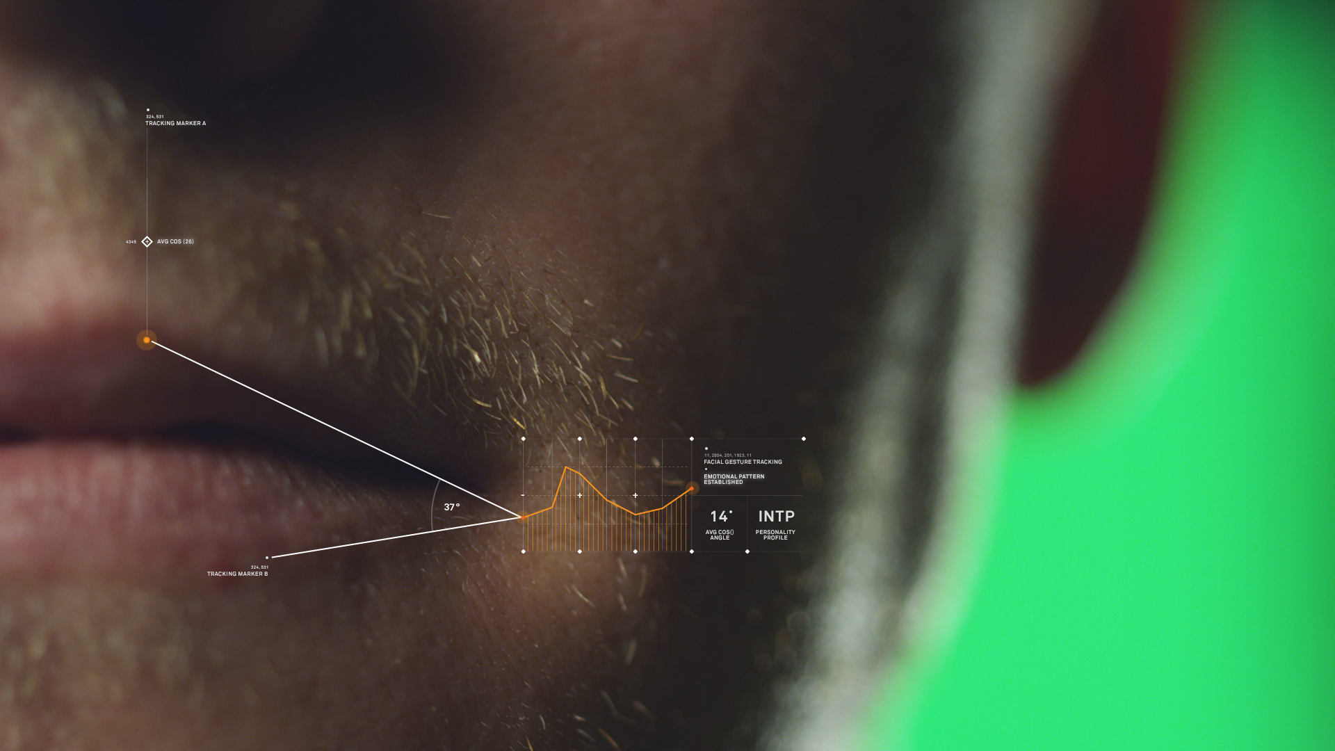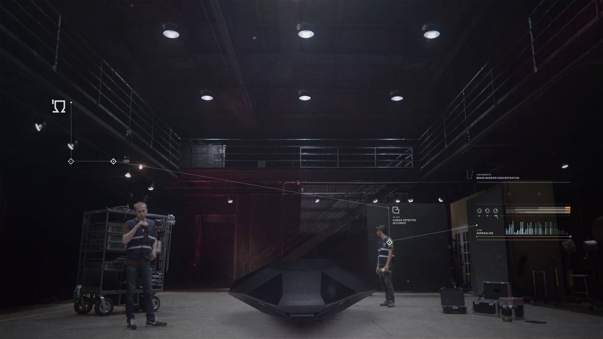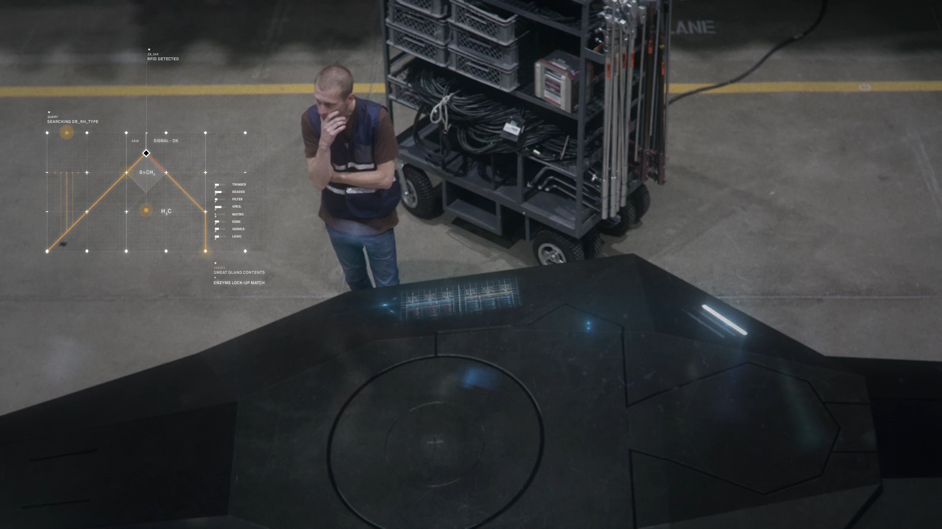 The UI was meant to be as minimal and unobtrusive as possible from the film. The gentle reminder an artificial intelligence is taking you through the film. We wanted to give the viewer the idea that the artificial intelligence gently touched its way through the molecules around a scene, picking up information as it moves.